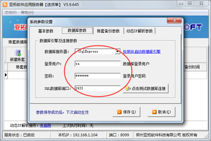 網絡版請在“亞拓軟件應用服務器”程序中,點菜單“文件”-》“系統參數設置”,在數據庫參數中輸入下圖所示的參數: