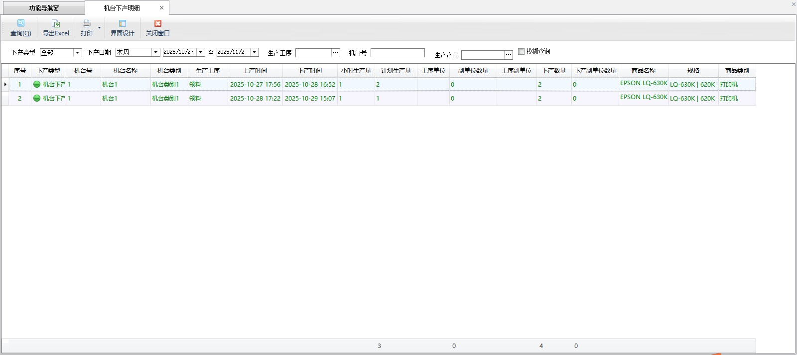 機臺生產明細查詢:可根據生產工序、生產產品、機臺號、下產狀態等條件查詢某個時間段內,工序本次生產產量、下產數量。