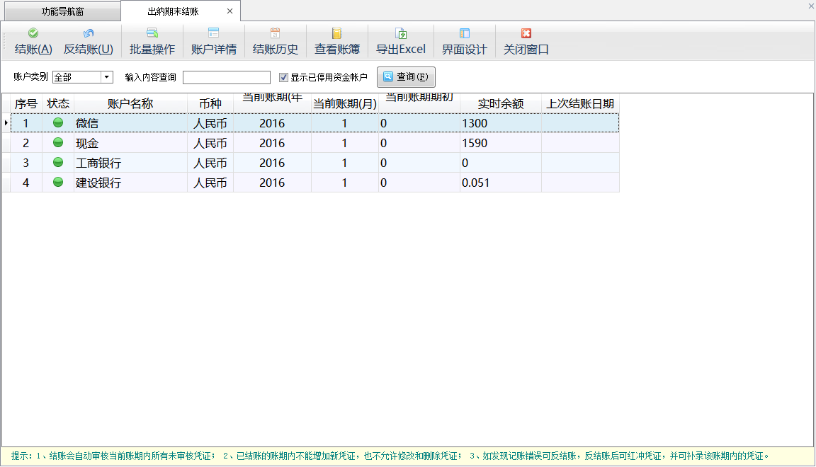 | 3 | 反結帳 | 在帳戶列表中,選擇已結帳的帳戶,點擊工具欄中的“反結帳”按鈕即可返回至上一賬期。 |