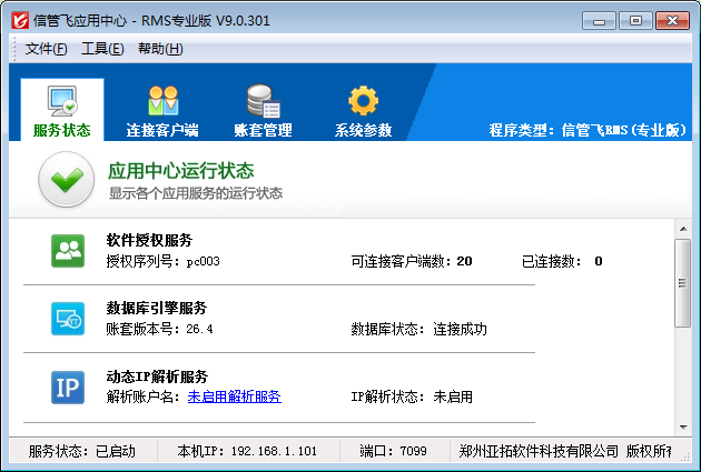 ????“應用中心”是信管飛RMS的管理控制中心,集中管理連接客戶端和賬套數據庫,從而實現數據的集中存儲和實時共享。應用中心主要包括運行狀態管理、連接客戶端管理、賬套管理、系統參數配置以及其他管理功能。
