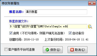 修改:修改賬套屬性時(shí),如果有客戶端已登錄這個(gè)賬套,則需要先退出客戶端程序,然后再進(jìn)行賬套屬性的修改。修改賬套屬性時(shí),可以不啟用賬套(即停用),停用后的賬套客戶端程序無法連接;設(shè)置是否自動備份賬套,如果設(shè)置自動備份,并且系統(tǒng)參數(shù)設(shè)置中也啟用了賬套備份,則軟件會按照賬套備份參數(shù)中的時(shí)間間隔定期備份此賬套。
