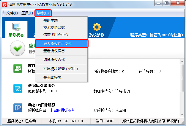 ????在軟件升級(如單機版升級為網絡版,網絡版增加用戶數時),使用加密鎖形式授權時,點菜單“幫助”—》“導入授權文件”,輸入授權序列號,然后點“獲取授權”按鈕可以從信管飛云應用中心獲取最新的授權許可,獲取授權許可信息后,請重啟信管飛應用中心程序即可。使用授權號授權時,點菜單“幫助”—》“獲取授權許可”,點擊獲取授權按鈕,獲取授權許可信息后,請重啟信管飛應用中心程序即可。