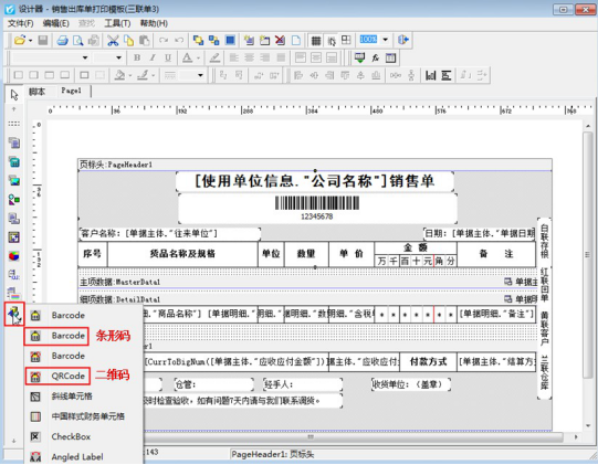 ????單據(jù)確認(rèn)開單后,可打印出單據(jù)編號(hào)的條形碼發(fā)給倉庫人員,條形碼可在打印模板中進(jìn)行設(shè)置,開單界面打印按鈕下點(diǎn)擊打印格式設(shè)計(jì),在打印格式設(shè)計(jì)界面點(diǎn)擊“設(shè)計(jì)格式”,進(jìn)入模板設(shè)計(jì)器界面,點(diǎn)擊左側(cè)工具欄的最后一個(gè)圖標(biāo),選擇第二個(gè)“Barcode”后在模板上添加文本框,然后雙擊打開文本框,彈出的條碼編輯器中代碼取“單據(jù)主體-單據(jù)編號(hào)”、條碼類型取“Code128”(二維碼選擇“QRCode”;二維碼直接雙擊選擇數(shù)據(jù)項(xiàng)單據(jù)主體-單據(jù)編號(hào)),設(shè)置好后點(diǎn)擊確定,然后預(yù)覽模板可顯示單據(jù)編號(hào)的條形碼信息。如下圖所示: