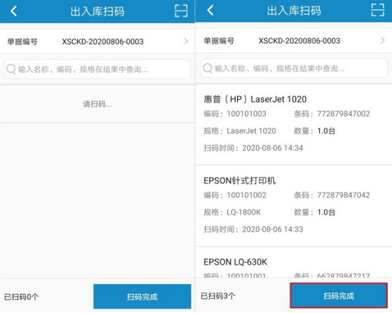 ????出入庫掃碼界面,點(diǎn)擊右上角掃描圖標(biāo),然后掃描單據(jù)編號(hào)的條形碼,掃碼后自動(dòng)進(jìn)入掃描商品信息界面,繼續(xù)點(diǎn)擊掃描圖標(biāo),針對商品的條形碼進(jìn)行掃描,會(huì)自動(dòng)獲取商品信息到出入庫掃碼界面,(默認(rèn)掃描數(shù)量為1,如存在出庫多個(gè)相同商品,可掃描多次)掃描完成后點(diǎn)擊“掃碼完成”,如下圖所示: