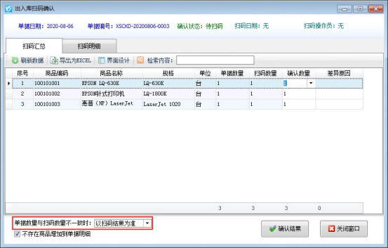 ????以上操作完成后,打開電腦開單界面,在更多操作下點(diǎn)擊“倉庫掃碼確認(rèn)”,進(jìn)入出入庫掃碼確認(rèn)界面,如一致則黑體顯示(掃碼數(shù)量大于單據(jù)數(shù)量和掃碼商品單據(jù)中不存在是藍(lán)色顯示),點(diǎn)擊“確認(rèn)結(jié)果”,彈出提醒界面,掃碼數(shù)量和出庫數(shù)量一致可直接點(diǎn)擊“確定”,確定后,刷新出庫單界面,掃碼狀態(tài)為“已掃碼”,顯示掃碼數(shù)量,然后開單人員直接審核單據(jù),出庫操作就此完成,如下圖所示: