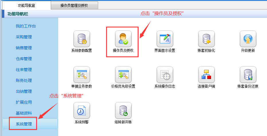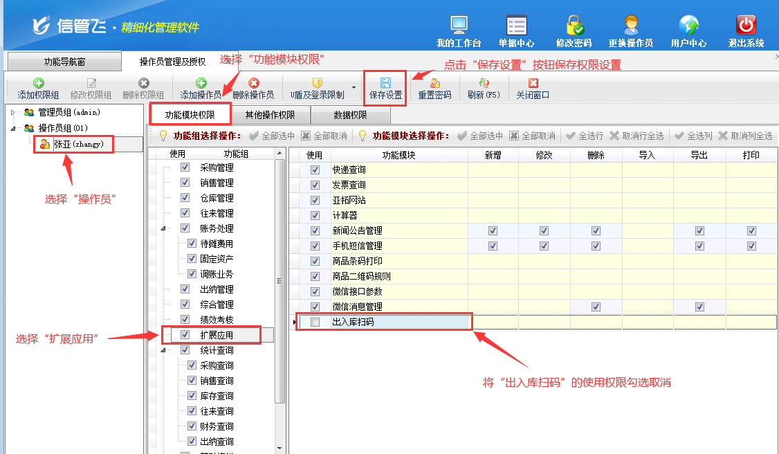 ????在功能導(dǎo)航窗點(diǎn)擊“系統(tǒng)管理”—》“操作員及授權(quán)”,進(jìn)入“操作員管理及授權(quán)”界面,選擇操作員“張亞”,在其右側(cè)的功能模塊權(quán)限內(nèi)選擇“擴(kuò)展應(yīng)用”模塊,將出入庫掃碼的“使用”權(quán)限勾選取消,然后保存設(shè)置,如下圖所示。