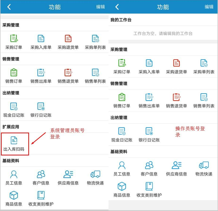 ????操作員賬號(hào)登錄手機(jī)APP同樣無法查看“出入庫掃碼”功能,如下圖所示: