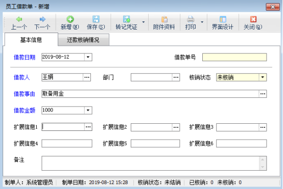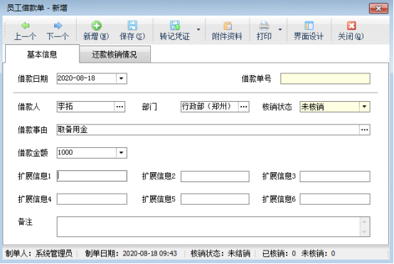 ????在員工借款管理界面工具欄點擊“新增借款單”,打開新增借款單界面可以錄入借款信息,借款信息填寫完成后保存借款單,借款單保存后,新增借款單界面工具欄點擊“轉記憑證”即可轉記現金及銀行憑證。