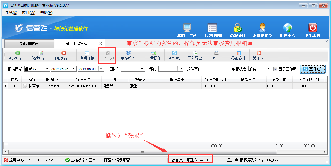 ????權限設置完成后,使用操作員“張亞”登錄軟件,打開費用報銷管理界面,可以看到工具欄“審核”按鈕為灰色的,操作員無法審核費用報銷單。如下圖二所示: