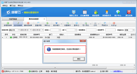 ????在日常工作中,因為臨時事件的發生,員工經常會自己墊付工作所需要的各項費用。這些費用在月末時可以填寫費用報銷單進行統一的報銷。信管飛出納記賬軟件專業版有費用報銷管理功能,可以管理費用報銷單,并支持設置操作員費用報銷單審核權限,下文我們詳細介紹一下出納記賬軟件內如何設置操作員不允許審核費用報銷單?