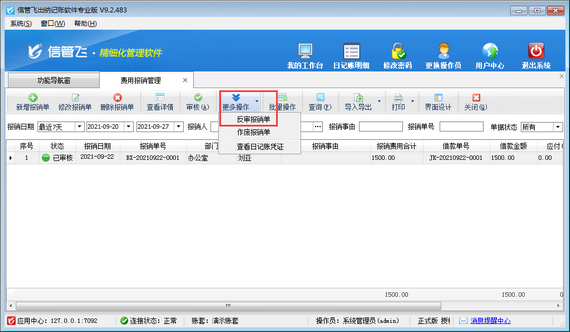 ????在功能導航窗點擊“綜合管理”—》“費用報銷管理”打開費用報銷管理界面,選擇一個已審核的費用報銷單,然后在工具欄點擊“更多操作”—》“反審報銷單”,系統會彈出提示信息“您確認要反審當前報銷單記錄嗎?”,點擊“確定”按鈕即可對已審核的費用報銷單進行反審操作,反審后,費用報銷單狀態變為“待審核”,此時可以對這個待審核的費用報銷單進行修改操作,如下圖所示。