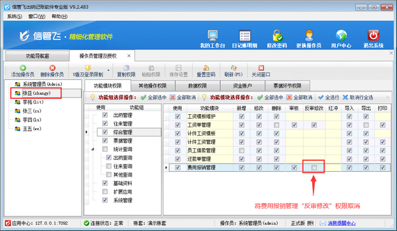 ????在功能導航窗點擊“系統管理”—》“操作員及授權”打開操作員管理及授權界面,選擇操作員“張亞”,在功能模塊權限界面,選擇“綜合管理”—》“費用報銷管理”,把費用報銷管理“反審修改”權限勾選取消,然后保存權限設置,如下圖所示: