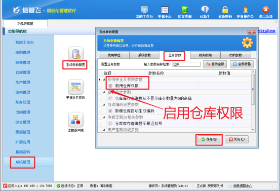在使用信管飛軟件進行新增倉庫時,是否遇到過這樣的困擾:操作員在倉庫信息界面新增了倉庫,卻發(fā)現(xiàn)新增的倉庫信息如同“石沉大海”,根本無法顯示,這嚴重影響了工作效率,出現(xiàn)這種問題的主要原因在于該操作員賬號沒有分配到倉庫權限導致的,本篇文章介紹下如何解決? 首先,切換系統(tǒng)管理員登錄,功能導航窗點擊“系統(tǒng)管理”—》“系統(tǒng)參數(shù)配置”—》“業(yè)務參數(shù)”進入業(yè)務參數(shù)配置界面,在系統(tǒng)安全及權限參數(shù)中勾選“啟用倉庫權限”參數(shù),如圖: 之后點擊“系統(tǒng)管理”—》“操作員及授權