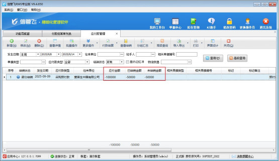 信管飛管理軟件專業(yè)版、標準版、星光版都支持錄入預付款,預付款是提前預付訂金,這種情況下貨物還沒有發(fā)出。如果還沒有形成相應的訂單,這時我們可以直接錄入往來單位的預付款。下面我們以信管飛軟件為例來演示一下具體的操作步驟。 已支付供應商采購預付款10萬元,供應商退回5萬元該如何在系統(tǒng)里面登記呢?首先在應付款管理界面找到登記的預付款記錄,如圖所示: 在付款結算單界面單獨結算這一筆采購預付款的賬單,付款金額錄入-50000元,可以在備注項錄入供應商退回以便后續(xù)