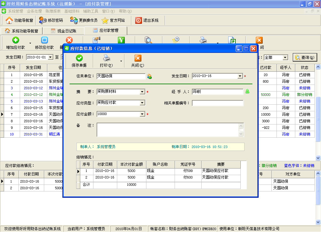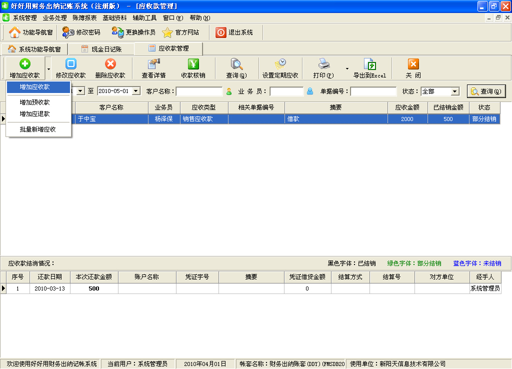 2、獨(dú)有應(yīng)收應(yīng)付款雙向核銷(xiāo)機(jī)制,通過(guò)建立定期應(yīng)收應(yīng)付,讓你未雨綢繆,及早掌控財(cái)務(wù)方向