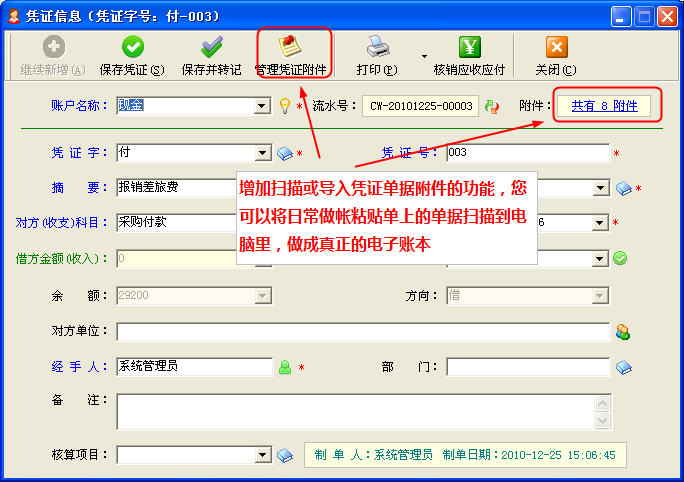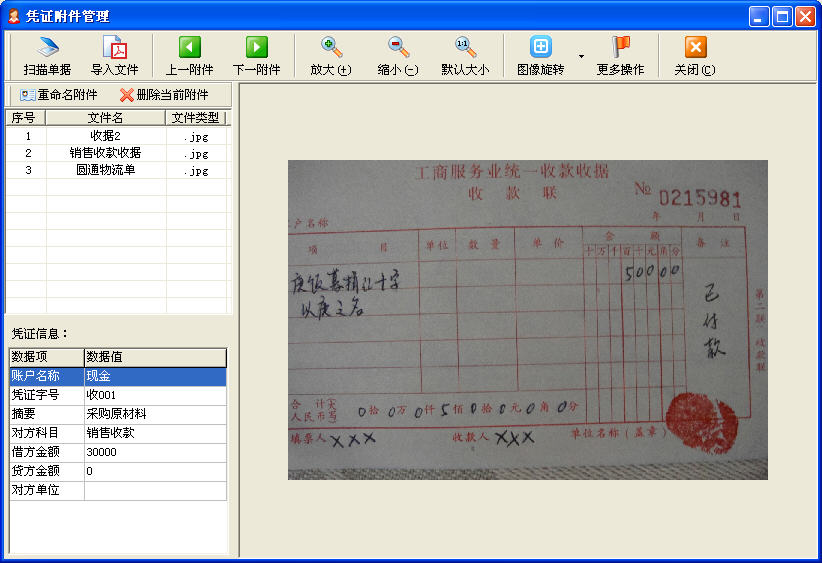 1、憑證錄入窗口可管理憑證附件,可掃描或導入電子文件。