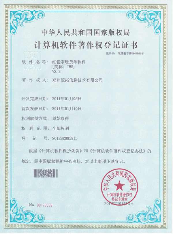 日前,亞拓軟件開發(fā)的一款送貨單打印軟件——《紅管家送貨單軟件》的最新版本,再次獲得國家版權(quán)中心軟件著作權(quán)證書(登記號(hào):2012SR095915),您可在國家版權(quán)登記中心網(wǎng)站的版權(quán)數(shù)據(jù)庫中進(jìn)行查詢。獲得著作權(quán)認(rèn)證標(biāo)志著這款軟件產(chǎn)品得到了國家級(jí)認(rèn)可,軟件的質(zhì)量具有一定的保證,同時(shí)軟件的版權(quán)也獲得了法律保障!