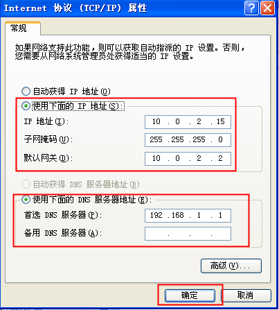 ④在“Internet協議(TCP/IP)屬性”的界面選擇“使用下面的IP地址”,把剛才記下的“IP地址”、“子網掩碼”、“默認網關”和“DNS服務器”的信息填入完整,最后點擊“確定”按鈕即可。
