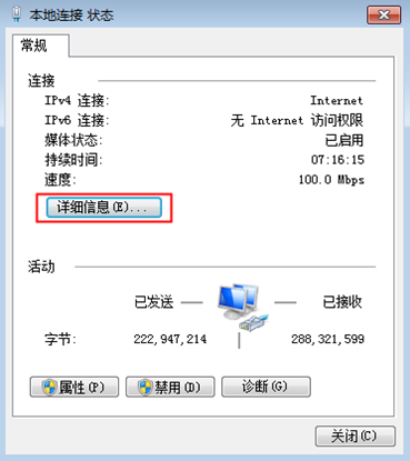 ②本地連接狀態如圖12所示,點擊“詳細信息”按鈕,會出現如圖13所示的網絡連接詳細信息,此時需要記一下“IPv4地址”、“IPv4子網掩碼”、“IPv4默認網關”和“IPv4 DNS服務器”的信息,后面固定IP地址時需要用到。