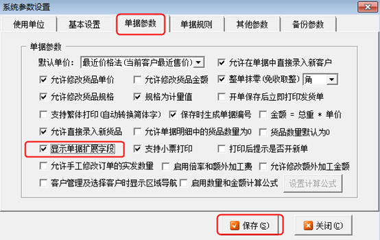 ①打開紅管家送貨單軟件→系統管理→系統參數→單據參數,勾選上“顯示單據擴展字段”點擊“保存”按鈕,如圖2所示。
