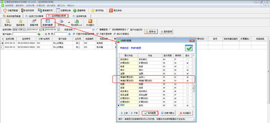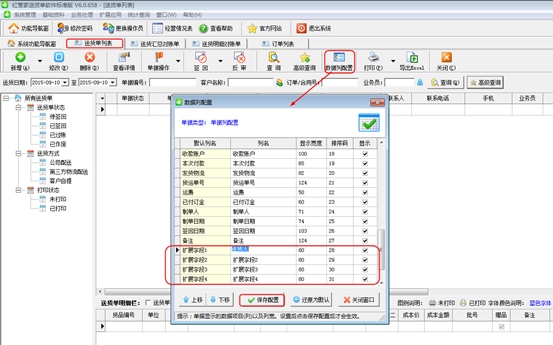 ②送貨單列表界面點擊“數據列配置”會彈出數據列配置的窗口,勾選上所需要的擴展字段,此時可以對“列名”進行更改,例如圖3中把擴展字段1的列名改為“送貨人”。最后點擊“保存配置”按鈕。
