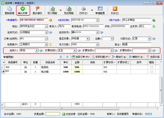 ③打開新開送貨單的界面,此時會顯示擴展字段的信息,新開送貨單的信息填好后點擊“確認開單”保存單據,如圖4所示。