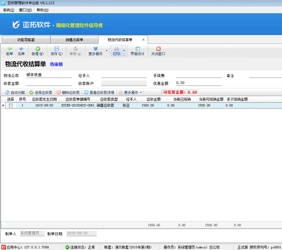 2、物流代收結算:在功能導航窗點“往來管理”—》“物流代收結算”即可進入物流代收結算單界面,如下圖2所示。