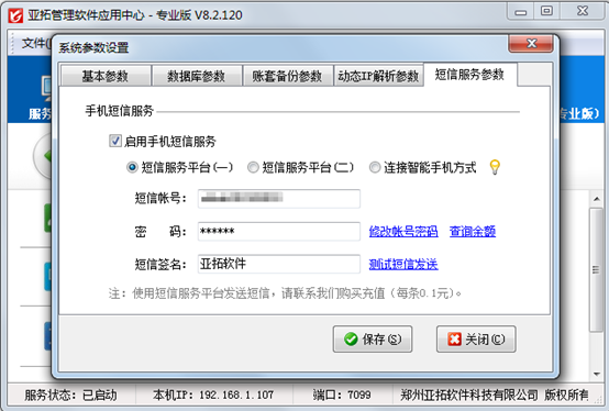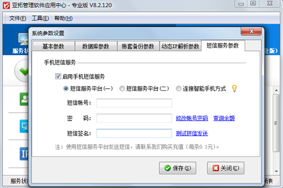 打開亞拓軟件應用服務中心—》系統參數—》短信服務參數,如下圖1所示。