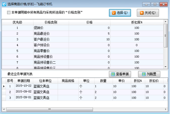 (2)我們以圖1中所設置的銷售價格啟用商品最近價、商品預設售價為例來開銷售出庫單,如下圖2而所示,當我們選擇商品后軟件會根據啟用不同價格策略的優先級自動調取商品的銷售價格,這次出庫單中由于這兩種商品之前已經銷售過,所以軟件自動調取出商品的最近價。我們可以明細欄中點“更多操作”—》“選擇價格”中查看不同類別的價格以及最近業務單據,如下圖3所示。