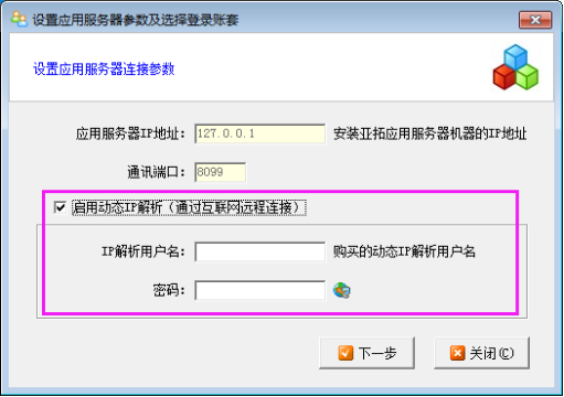 打開客戶端登錄界面的“選擇賬套”按鈕,然后勾選“啟用動(dòng)態(tài)IP解析”,填寫IP解析用戶名和密碼,點(diǎn)擊“下一步”,進(jìn)入選擇賬套的界面,選擇賬套后回到登錄界面,選擇操作員并輸入密碼,進(jìn)入軟件首頁。