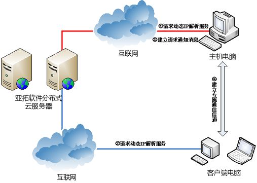 ①主機(jī)電腦向亞拓軟件云服務(wù)器發(fā)送動(dòng)態(tài)IP解析服務(wù)請(qǐng)求。