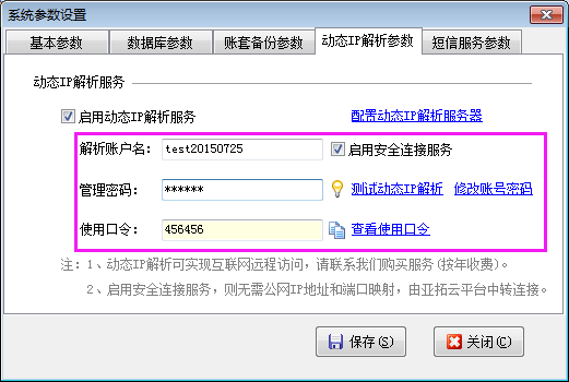 ②主機(jī)電腦配置動(dòng)態(tài)IP解析服務(wù)參數(shù),并定時(shí)將公網(wǎng)IP地址信息發(fā)送給亞拓軟件云服務(wù)器。