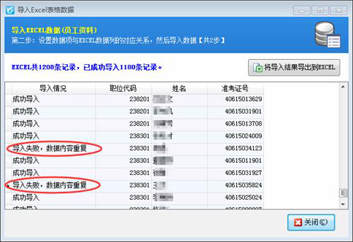 導入過程中軟件會實時顯示導入進度,如果數據量比較大時,導入進度達到100%時軟件進行數據提交會比較耗時。導入結束后,軟件會顯示導入的結果。沒有導入的記錄軟件會給出相應的原因,如下圖6所示。