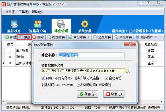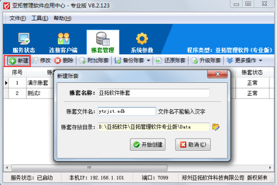 打開亞拓管理軟件應用中心(桌面右下角紅色的圖標)—》“賬套管理”即可進入賬套管理界面,如下圖1所示: