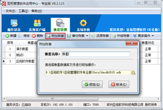 亞拓管理軟件亞拓倉庫管理軟件中都含有賬套管理功能,賬套管理實現賬套數據庫的集中管理,包括新建賬套、修改賬套屬性、刪除賬套、附加賬套、備份賬套、還原賬套和升級賬套等功能。下面我們以亞拓管理軟件為例來演示一下賬套管理中各個功能具體的操作方法。