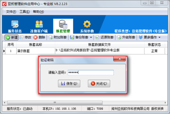 應用中心的管理和配置會對軟件的運行產生重大影響,因此軟件提供增強安全驗證功能,啟用安全驗證后執行賬套管理、系統參數設置等功能時會要求輸入密碼,驗證密碼通過后才可以進行相應操作。下面我們以亞拓管理軟件專業版應用中心為例詳細介紹下“啟用安全驗證”功能該如何使用。