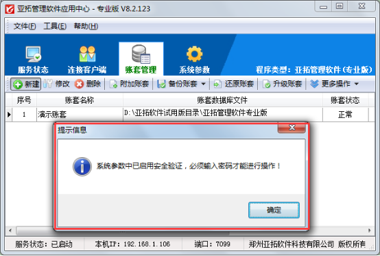 啟用安全驗證之后,我們如果需要進行新建賬套、修改賬套、刪除賬套、還原賬套、升級賬套、修改系統參數設置等操作時,系統會要求輸入驗證密碼,驗證通過后才可以繼續相應操作,如果輸入密碼錯誤或者是不輸入密碼,則不能繼續進行相應操作。