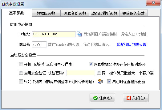 系統(tǒng)參數(shù)設置主要包括基本參數(shù)、數(shù)據(jù)庫參數(shù)、賬套備份參數(shù)、動態(tài)IP解析參數(shù)、短信服務參數(shù)等,亞拓管理軟件亞拓倉庫管理軟件的應用中心都包含系統(tǒng)參數(shù)設置功能,下面我們以亞拓管理軟件為例來介紹一下系統(tǒng)參數(shù)設置的相應功能。