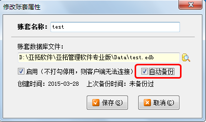 賬套備份參數(shù)可設置是否啟用自動備份、備份時間間隔和備份目錄。我們強烈建議啟用自動備份,以便賬套出現(xiàn)問題的時候從賬套備份文件中恢復數(shù)據(jù)。