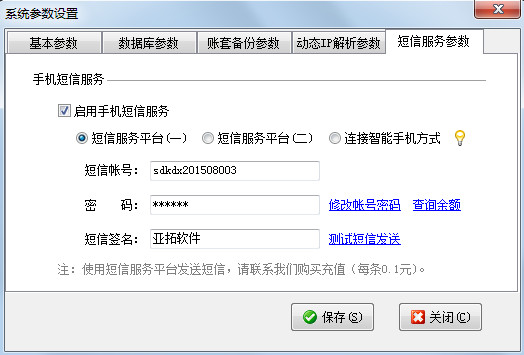 短信簽名:發(fā)送的每條短信必須加入簽名,一般使用公司簡稱,如“亞拓軟件”。不要太長避免占用過多短信字數(shù)。