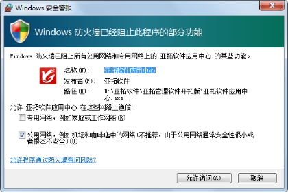 首次運行應用中心程序,如果防火墻彈出提示窗口,則Win7系統請點擊“允許訪問”按鈕允許訪問(專有網絡不需要打勾選擇);WinXP系統請點擊“解除阻止”按鈕即可。