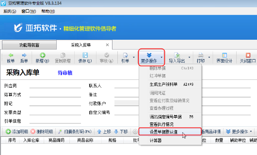 登錄亞拓管理軟件,在功能導航窗點“采購管理”—》“采購入庫單”,進入采購入庫單界面,如圖2所示,點擊“更多操作”按鈕,點擊“設置單據默認值”,系統彈出“設置單據默認值”窗口,如圖3所示。