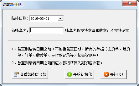 進行結轉新開賬后軟件會新建一個賬套,之前的賬套還是會存在的。結轉后截止到結轉日期之前(不包括截至日期)所有的單據(送貨單、退貨單、訂單、收款單、應收款記錄等)都會被刪除;截止到結轉日期之前的應收款將結轉為期初應收款,如果你需要查看之前的單據可以選擇原來的賬套進行查詢,下面我們來演示一下具體的操作步驟。