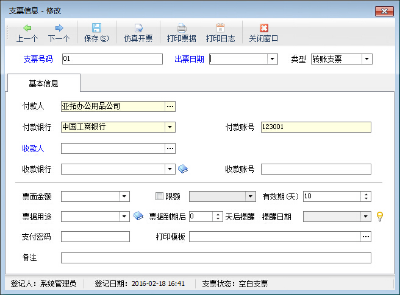 用于修改一張支票的信息。在“支票管理”界面,單擊工具欄中的“修改支票”按鈕,彈出修改支票窗口,修改支票信息后點(diǎn)擊“保存”按鈕進(jìn)行保存。修改支票的界面可以進(jìn)行仿真開票打印支票,可以查看打印日志。