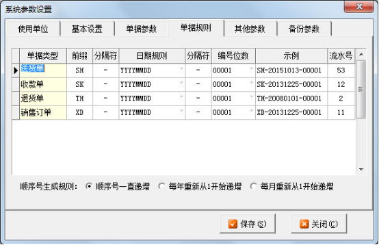 2、順序號(hào)生成規(guī)則設(shè)置:可配置各類單據(jù)按順序號(hào)一直遞增、每年重新從1開(kāi)始遞增以及每月重新從1開(kāi)始遞增,將各項(xiàng)數(shù)據(jù)配置好之后點(diǎn)擊保存即可。
