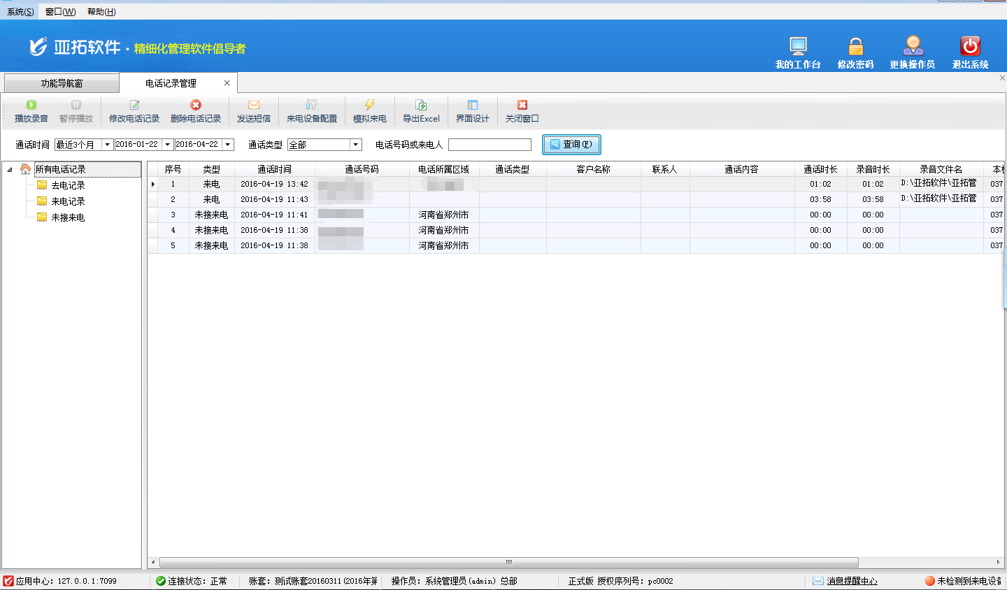 在電話記錄管理界面選擇通話時(shí)間,輸入來電號(hào)碼或者來電人信息查詢即可查詢到我們所需要的來電信息,選擇所需要的來電信息,點(diǎn)擊“播放錄音”按鈕即可播放當(dāng)前來電的通話自動(dòng)錄音。