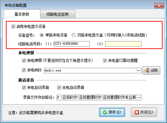 來電設(shè)備配置:使用來電彈屏功能首先需要外接設(shè)備來電顯示盒,來電顯示盒連接配置好之后需要在軟件內(nèi)啟用來電顯示設(shè)備并設(shè)置線路電話號(hào)碼,來電顯示配置如下圖所示: