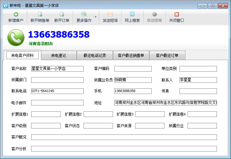 來電彈屏:客戶來電時(shí),來電彈屏窗口會(huì)自動(dòng)顯示出在“基礎(chǔ)資料”——》“客戶資料”內(nèi)維護(hù)好的此客戶的相關(guān)信息、客戶最近電話記錄、客戶最近銷售單及客戶最近訂單,使得您可以在通話之前可以全面了解客戶信息。