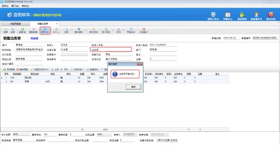 亞拓管理軟件、紅管家倉庫管理軟件開銷售單保存時業(yè)務(wù)員默認不能為空,如圖1所示;亞拓管理軟件、紅管家倉庫管理軟件開采購單保存時經(jīng)手人默認不能為空;紅管家送貨單軟件開送貨單保存時業(yè)務(wù)員也默認不能為空。如果您在開銷售單或采購單時不需要錄入業(yè)務(wù)員或經(jīng)手人,可以在軟件中進行設(shè)置。