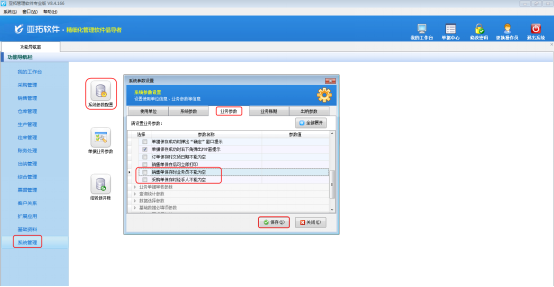 在功能導(dǎo)航窗中點擊“系統(tǒng)管理”—》“系統(tǒng)參數(shù)配置”,即可進入“系統(tǒng)參數(shù)設(shè)置”界面,點擊“業(yè)務(wù)參數(shù)”,如圖2所示,在業(yè)務(wù)單據(jù)保存參數(shù)內(nèi)找到“銷售單保存時業(yè)務(wù)員不能為空”參數(shù),把這個參數(shù)的勾選去掉,然后保存。